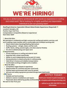 Above All Roofing is expanding, and we are looking for motivated, hardworking individuals to join our growing team. As one of Central Ontario’s leading exterior